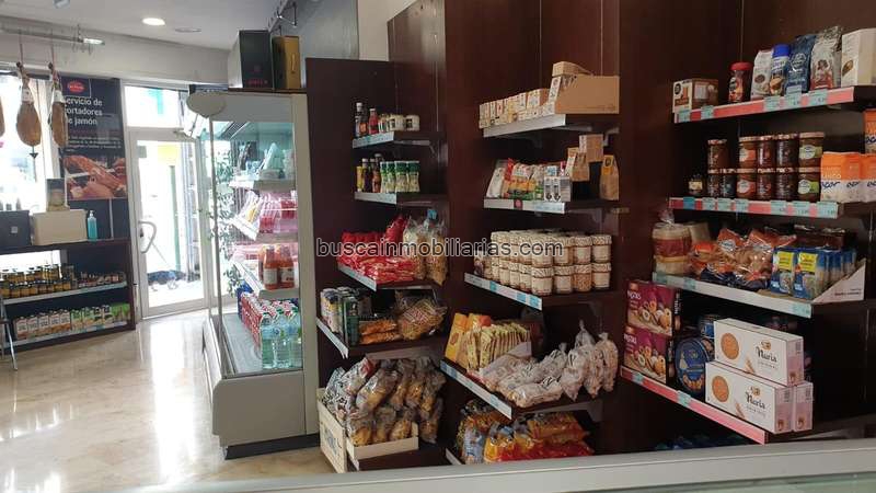 -Una zona de negocio a pie de calle, con dos grandes ventanales, estanterías para la exposición de productos, vitrinas y mostradores frigoríficos para la venta.
