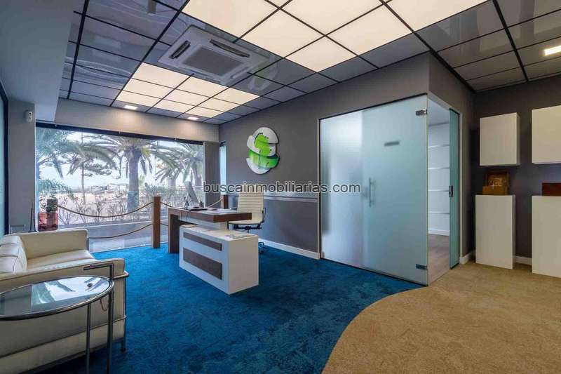 Al entrar, te recibe un salón recibidor con gran cristalera hacia el paseo y la playa, inundando el ambiente de luz natural. El despacho principal, también con un amplio ventanal y vistas directas al mar, ofrece un entorno perfecto para dirección o atención privada a clientes.