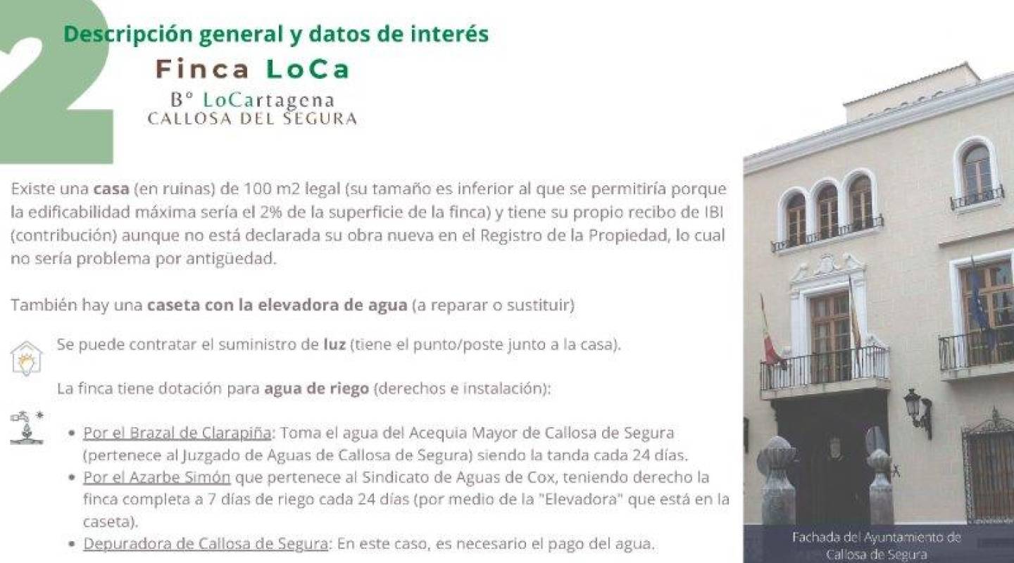 Finca de recreo, para vivir y o pasar temporadasExplotación agrícola. Con dotación de agua para plantar los cultivos típicos de la huerta: cítricos, hortalizas, verduras....Casa - Hotel rural: Reformando la casa, podría realizarse un negocio muy rentable teniendo en cuenta, sobretodo, que la pandemia ha modificado las preferencias de los turistas por este tipo de alojamientos en el campo. Se podría ampliar la superficie construida porque se permite una edificabilidad del 2% del suelo (casi 1000 m2) y sólo hay 100 m2 en la casa existente.A unos minutos de la montaña de Callosa, con rutas de senderismo, trekking, su vía ferrata, etc. También cerca del centro histórico monumental de la ciudad de Orihuela.A 25 minutos de las playas (Guardamar, La Mata, Orihuela Costa) y menos de una hora del aeropuerto de Alicante.Tiene 2 accesos con coche y está cerca de otras casas. Excelentes vistas a la montaña y al paisaje de huerta de la Vega Baja.