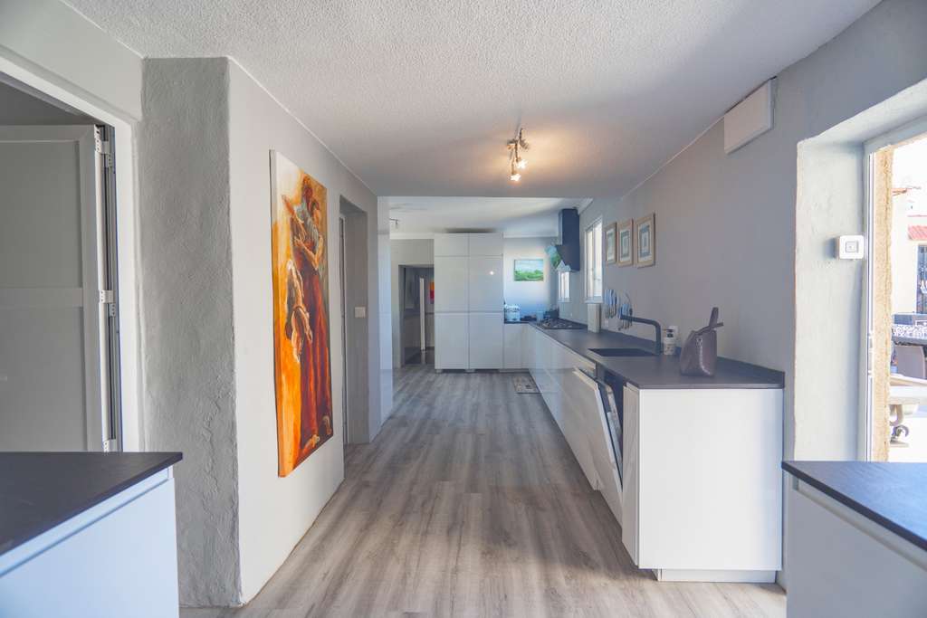 La casa principal ha sido completamente renovada para ofrecer comodidades modernas y un estilo de vida lujoso. La amplia cocina-comedor es elegante y contemporánea, con muebles blancos y amplio espacio para reuniones familiares. Junto a la cocina se encuentra un baño moderno y el primero de los dormitorios. Continuando por la casa, un pasillo conduce a dos dormitorios dobles adicionales, incluyendo una suite principal con sala de estar y baño privado.