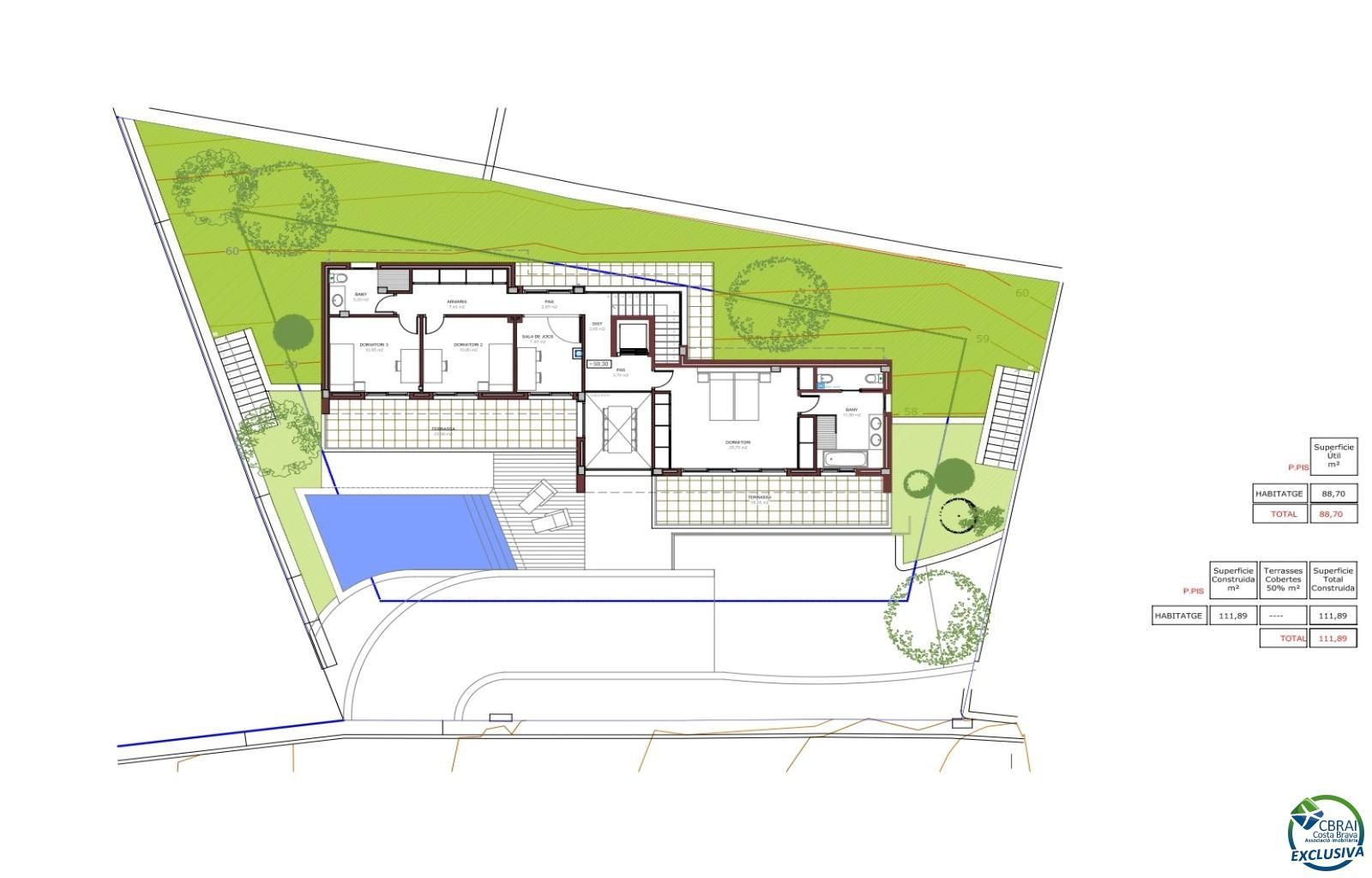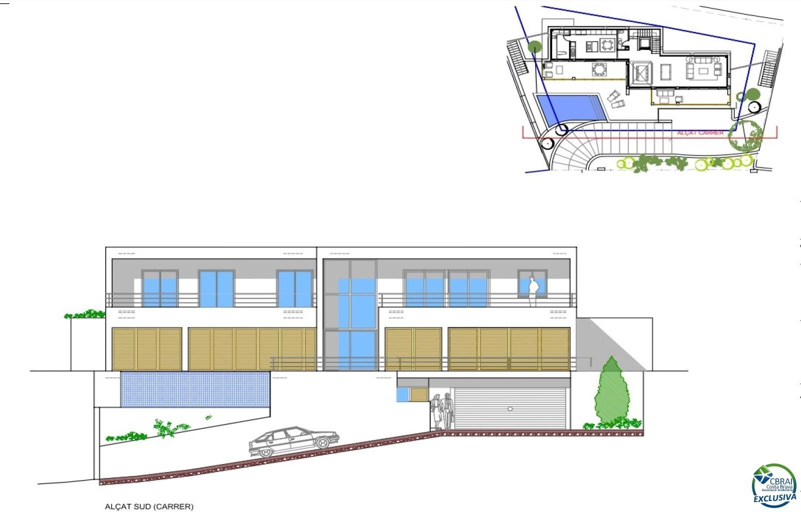 La superfície construida de la parcela en Roses, es de 115 m2 de vivienda, 18.50 m2 de porche y 42 m2 de garaje, con un total construido de 175,50 M2.