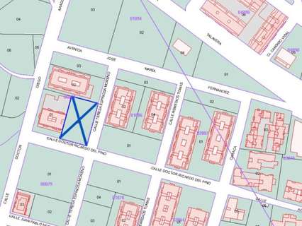 Se trata de una parcela rectangular y es esquina a dos calles diferentes con una longitud de fachada a una calle de 56,27 metros y a otra de 39,776 metros.