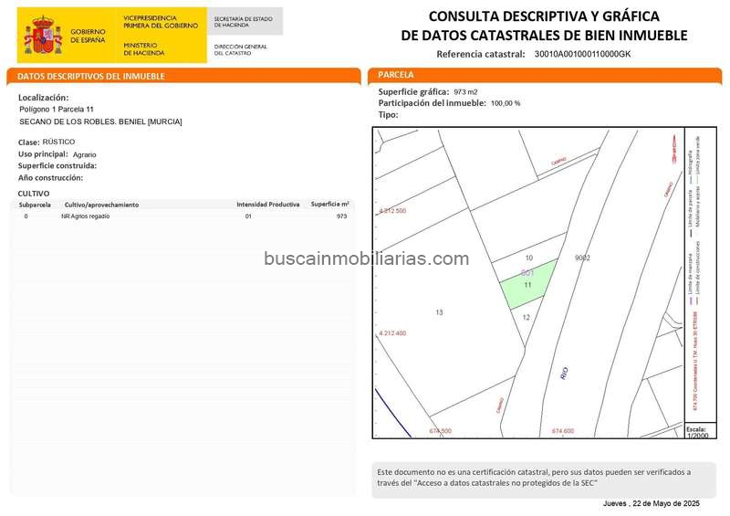 Parcela de 973m2 situada al lado del Rio Segura, muy cerca de Beniel. Da a camino y se puede conectar la luz.