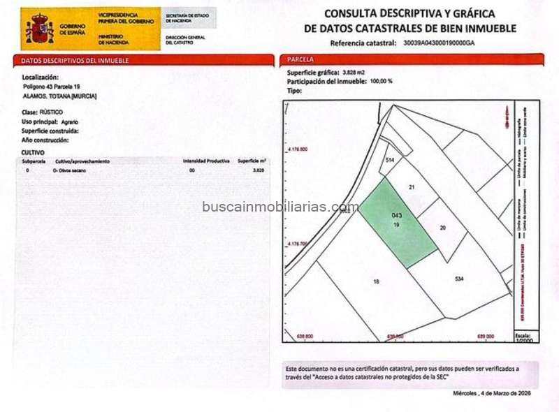 Presentamos un terreno rural excepcional ubicado en la tranquila zona de El Pareton, en Totana. Con una amplia superficie de parcela que alcanza los 3354 m2 y a solo 20 minutos del mar, esta propiedad brinda múltiples posibilidades para desarrollar proyectos agrícolas ideal rodeado por la naturaleza. Su orientación Norte-Sur asegura una buena exposición solar durante todo el día. A tan solo €13,900, esta es una oportunidad única para adquirir un espacio cultivable donde podrás dar rienda suelta a tus ideas y disfrutar del encanto rural murciano.