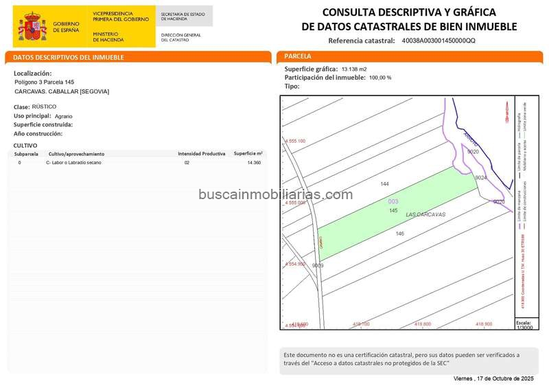 RS: Se ofrece en venta un excepcional suelo rústico ubicado en Caballar, con una superficie aproximada de 24.000 m2. Este terreno se compone de tres parcelas situadas en el Polígono 3: parcelaciones número 145, 146 y la parcela adicional identificada como9024. La propiedad presenta múltiples posibilidades para desarrollar proyectos agrícola, beneficiándose de su entorno natural y tranquilo que caracteriza a esta zona rural. Ideal tanto para inversores interesados en ampliar sus activos inmobiliario. No dude en consultarnos si desea más información sobre este atractivo inmueble; estaremos encantados de atenderle.