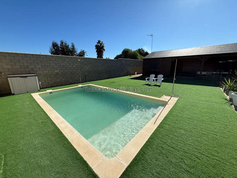 En la segunda zona del terreno, con una superficie aproximada de 400 m2, se encuentra el área destinada al ocio y disfrute. Destaca una piscina de agua salada, así como una construcción de madera con porche exterior. En su interior dispone de salón con cocina integrada, tres habitaciones y baño, ofreciendo comodidad y un ambiente acogedor para estancias o uso recreativo.