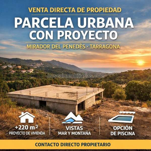 Se trata de una parcela urbana de aproximadamente 2.600 m2 ubicada en Mirador del Penedès (Tarragona), en un entorno natural con vistas abiertas a mar y montaña.