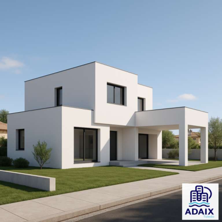 El proyecto original contempla una vivienda contemporánea de más de 400 m² construidos, con líneas minimalistas, fachada en monocapa blanco, grandes ventanales en aluminio antracita, patio interior ajardinado y piscina privada.