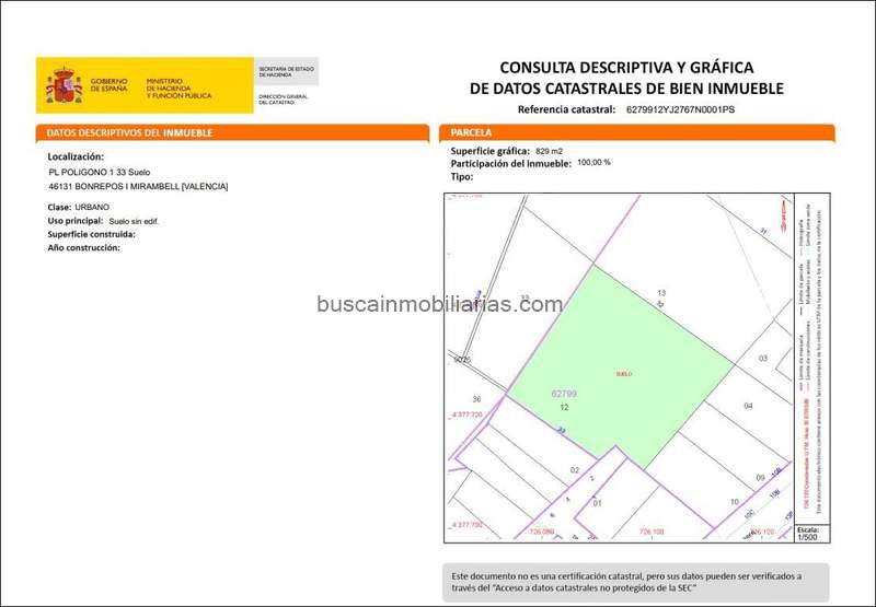Parcela de suelo rústico situada en el municipio de Bonrepòs i Mirambell, provincia de Valencia. Se encuentra en el Polígono 1, Parcela 33, y cuenta con referencia catastral 6279912YJ2767N0001PS.