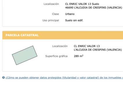 REFERENCIA: 301F7 Oportunidad parcela en Alcudia de Crespins. Zona muy tranquila. Parcela urbana sin edificar. La parcela da a calle Enric Valor y a la zona de parque situada entre dos calles. Sólo se puede construir a los laterales de esta, tanto el frontal como la parte posterior, quedan libres de construcción adosada. Magnífica oportunidad para emprender una proyecto nuevo en una zona en expansión.