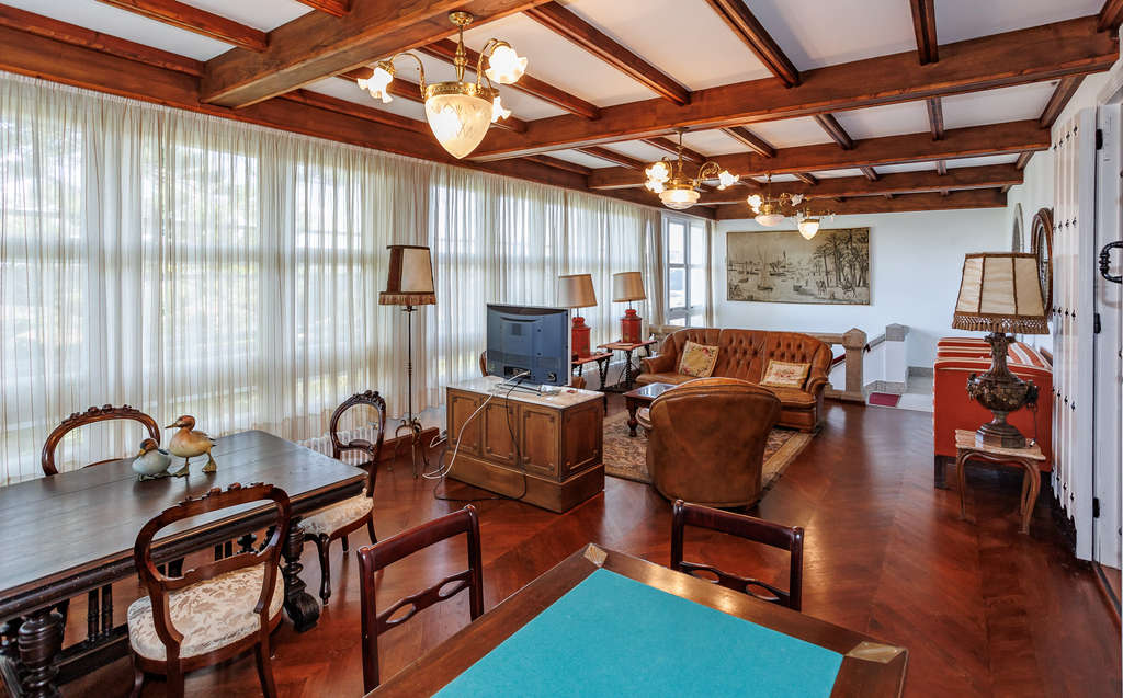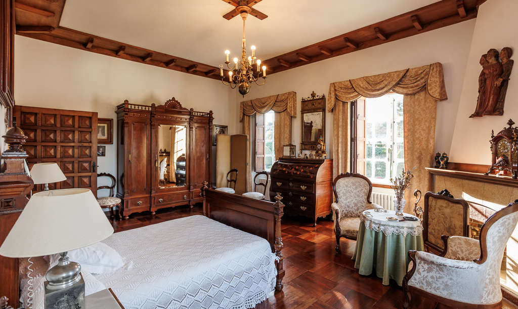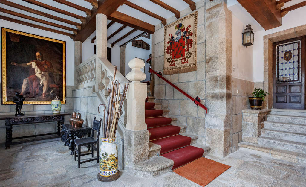 El pazo principal destaca por su torre con almenas, fachada señorial y espacios nobles con mobiliario de época. Incluye gran recibidor con escaleras de cantería, espectaculares salones con techos de vigas de madera, gran comedor para más de 20 personas, 11 dormitorios y 7 cuartos de baño.