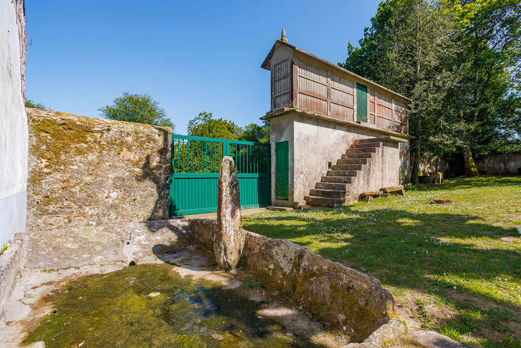 El conjunto incluye múltiples construcciones auxiliares: una enorme palleira de estructura tradicional, amplio garaje con horno de leña, precioso lavadero de piedra alimentado por el manantial, y casa de los antiguos caseros para rehabilitar con lareira tradicional.