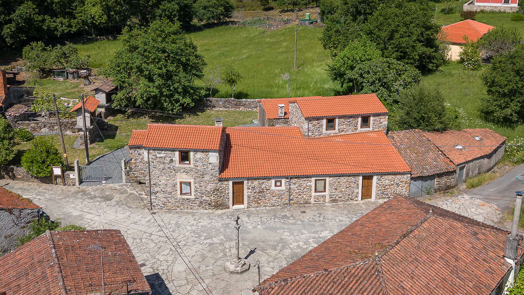 Este conjunto histórico se encuentra en una aldea medieval de la parroquia de Melide, en pleno Camino Francés, a pocos kilómetros del centro de Melide. La propiedad cuenta con 688 m² de superficie total y 286 m² construidos, y alberga dos casas de piedra adosadas, un hórreo tradicional gallego, un alpendre de piedra y zonas ajardinadas presididas por un carballo centenario.