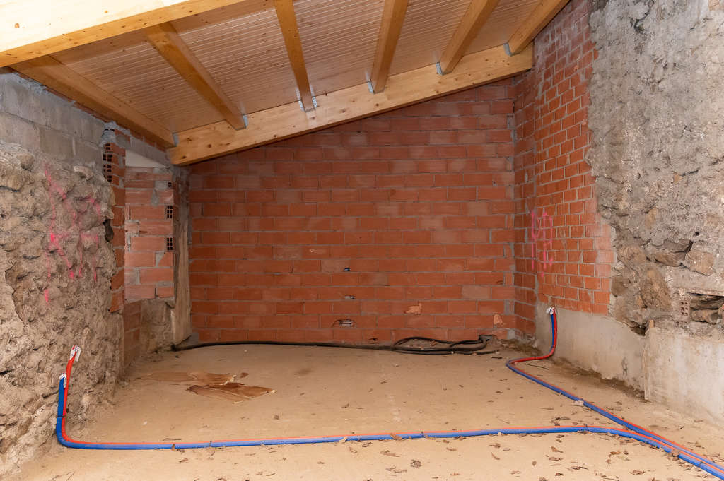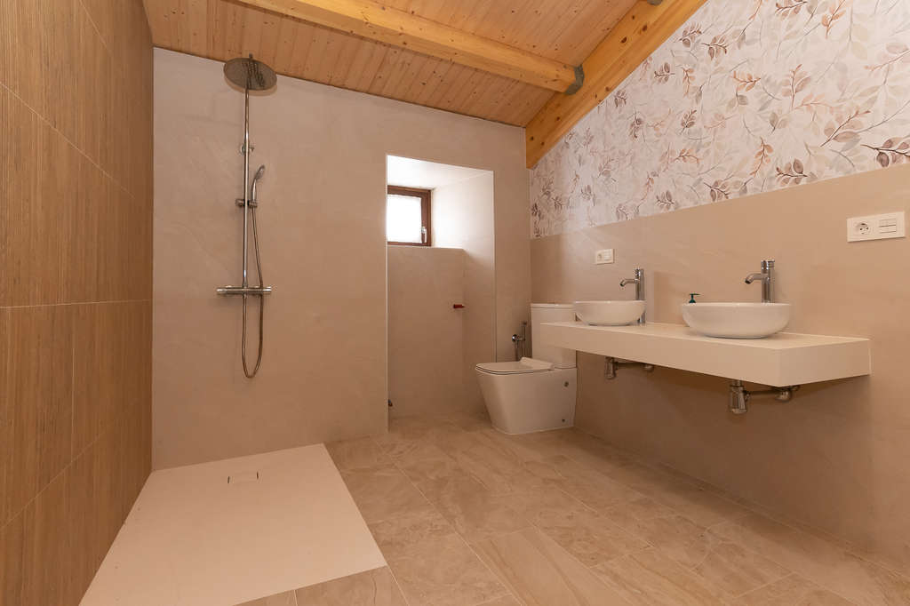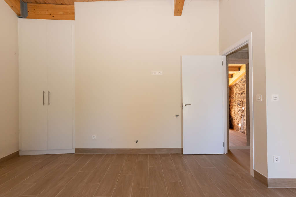 La casa principal está completamente restaurada y lista para amueblar y estrenar. Dispone de una amplia entrada que distribuye hacia un cuarto de baño completo, cocina equipada con muebles de madera, amplio salón con grandes ventanales y una habitación con armario empotrado y acceso directo al jardín. El piso superior alberga una habitación bajo cubierta con dos ventanas.