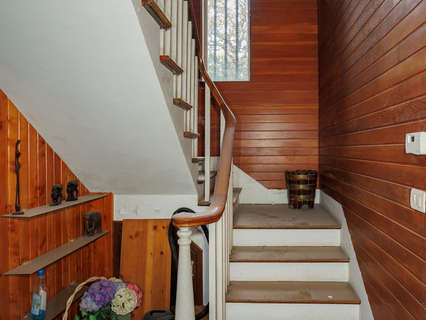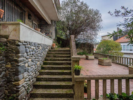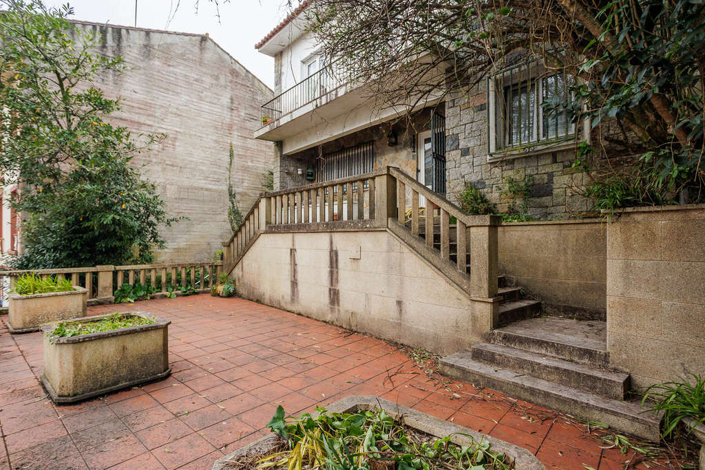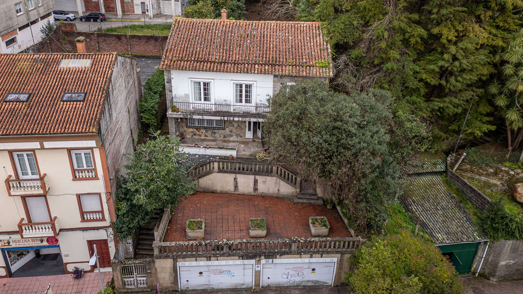 En la planta de calle se encuentran amplios garajes con capacidad para cuatro vehículos. El jardín incluye terraza pavimentada con jardineras de piedra, abundante vegetación y una pequeña construcción auxiliar con lareira tradicional.
