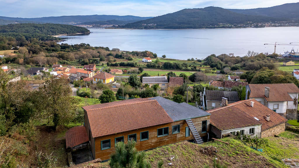 La propiedad cuenta con todas las instalaciones de electricidad, agua, saneamiento y calefacción completadas. Los grandes ventanales enmarcan vistas espectaculares a la ría de Noia y las montañas circundantes.
