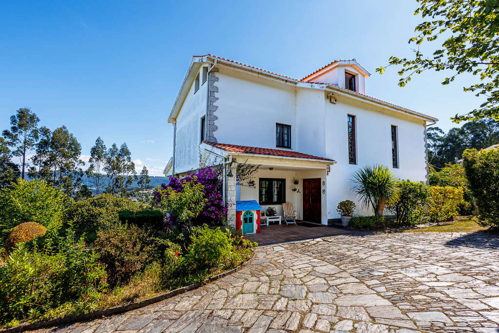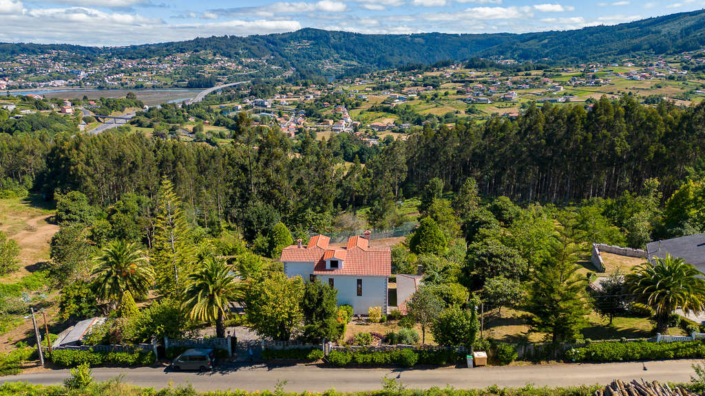 Este chalet unifamiliar se encuentra en Pontedeume, en los límites del Parque Natural Fragas del Eume. La propiedad cuenta con 540 m² construidos distribuidos en tres plantas y ático, sobre una finca de 6000 m².