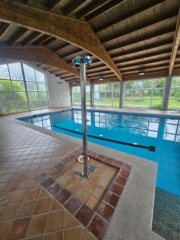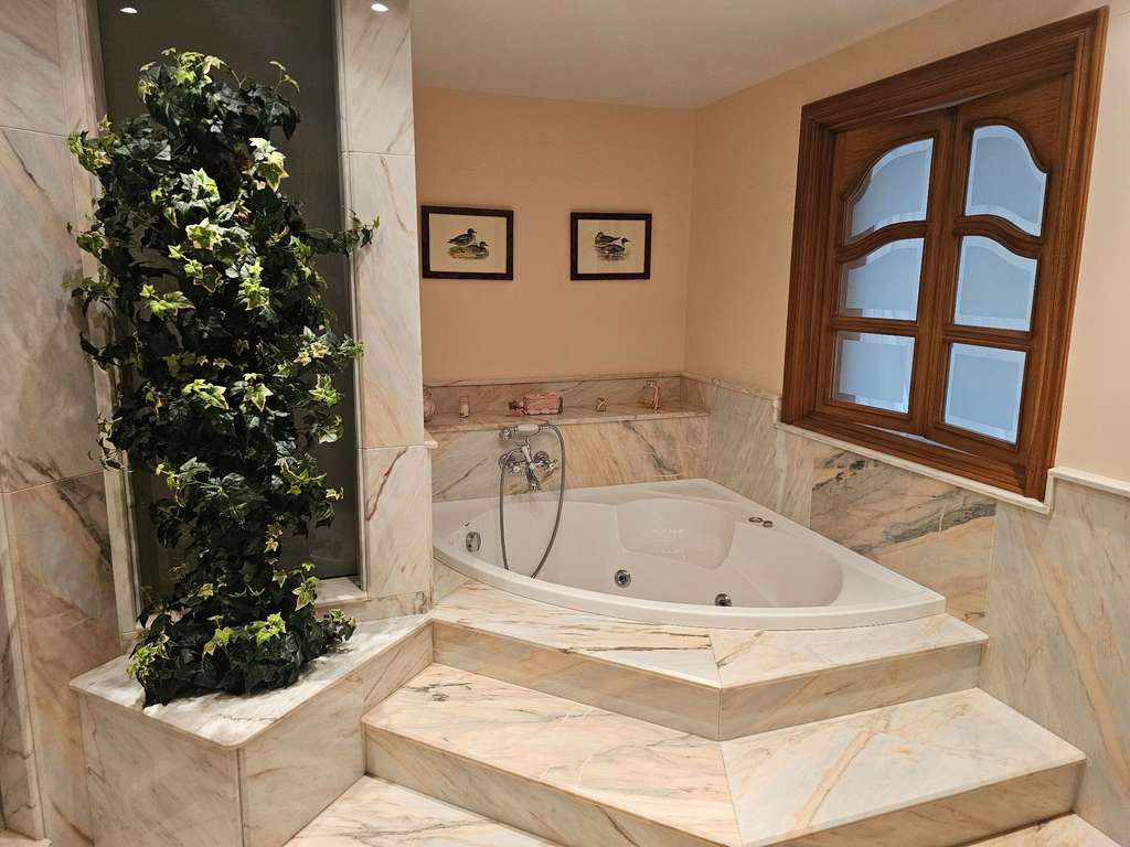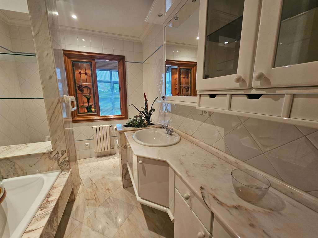 Planta baja: Desde el vestíbulo principal se accede a dos alas diferenciadas. La derecha alberga la zona de día con guardarropa, aseo, salón-comedor con chimenea y elegante biblioteca. La izquierda incluye una amplia cocina con office, lavandería, zona de plancha y despensa y un amplio espacio para el ocio y bienestar, donde nos encontramos con: Sauna, vestuarios femeninos y masculinos, baño completo y acceso al jardín interior que conecta con una piscina cubierta y climatizada, ideal para el disfrute durante todo el año.