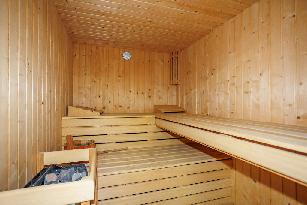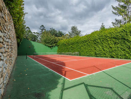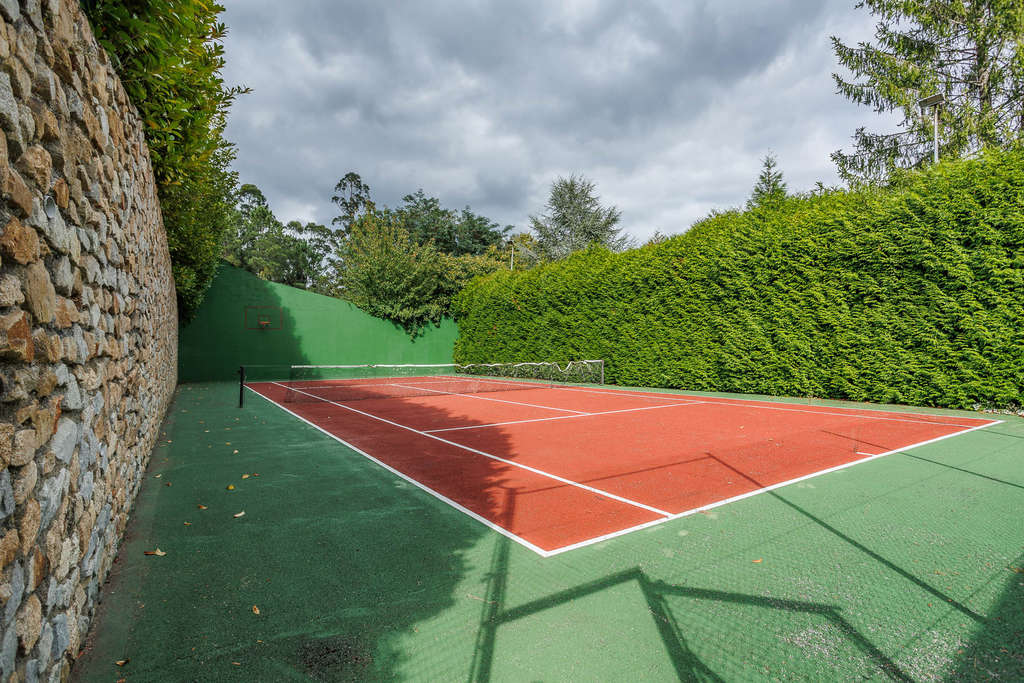 La propiedad cuenta con dos piscinas: una exterior integrada en los jardines y otra interior climatizada con mosaicos decorativos. El complejo deportivo incluye cancha de tenis reglamentaria, gimnasio completo con sauna y ducha.