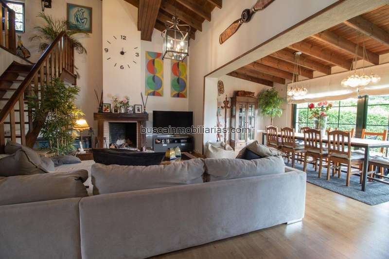 Cocina con isla totalmente equipada, salón con chimenea central , comedor con galerías acristaladas con vistas al jardín y piscina, acceso al porche exterior , al fondo el pasillo donde se encuentran las habitaciones , en planta alta se encuentra despacho con gimnasio.