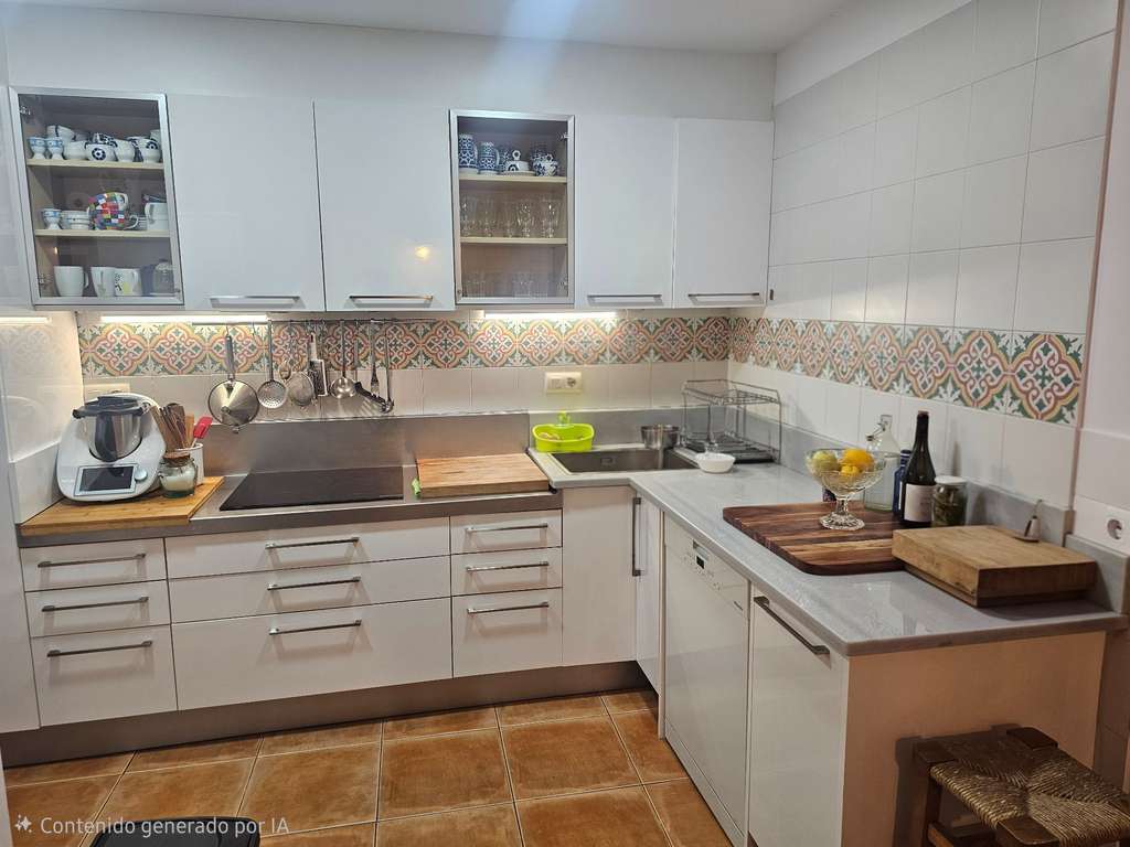 La cocina, luminosa y muy bien aprovechada, cuenta con ventana a la calle principal y un gran ventanal hacia el interior de la vivienda. Está totalmente equipada y ofrece una generosa zona de despensa, almacenaje y office, perfecta para quienes disfrutan de la cocina práctica y bien organizada.