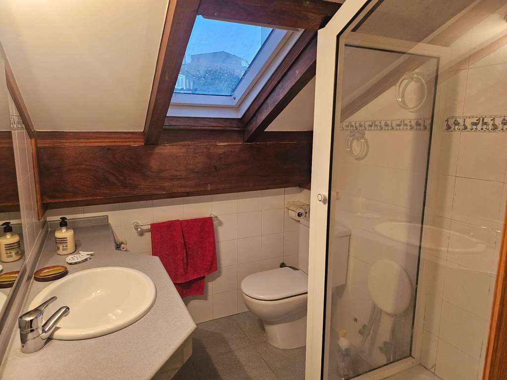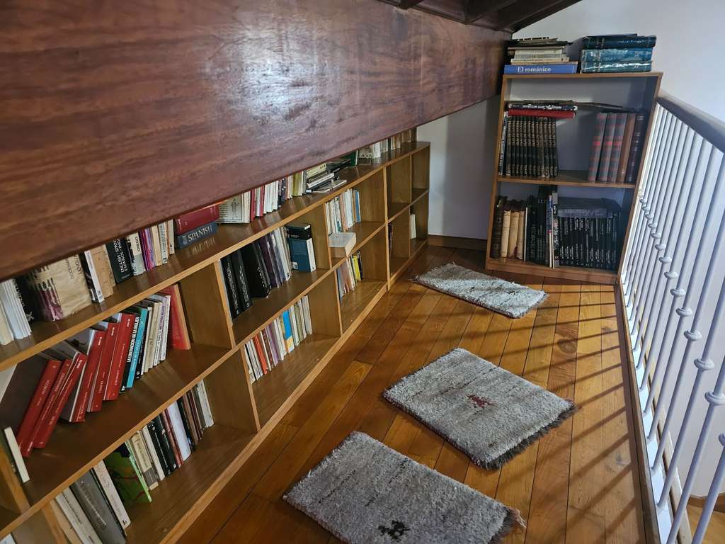 La zona bajo cubierta alberga un espacio polivalente con un dormitorio, un baño y ventanas tipo Velux que regalan vistas espectaculares a los monumentos de Santiago. Un rincón perfecto como estudio, zona de invitados o refugio creativo.