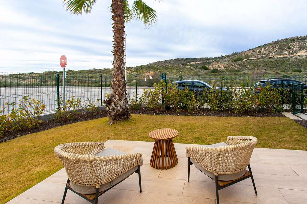 La propiedad ofrece una terraza soleada con espacio para un gran sofá exterior, mesa de comedor y tumbonas, con vistas al jardín comunitario y al paisaje montañoso. Para mayor relax, hay una segunda terraza en el jardín, ideal para un acogedor rincón de lectura o café. Gracias a las numerosas ventanas, el apartamento es luminoso y aireado, con vistas panorámicas desde todas las habitaciones.