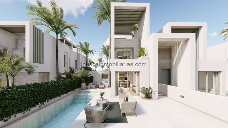Es un complejo de 30 Villas adosadas de tipo quad con piscina privada, ducha, aseo en exterior en la zona de la piscina, cocina de verano totalmente terminada y solárium.