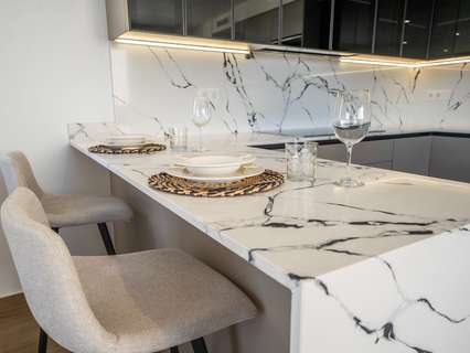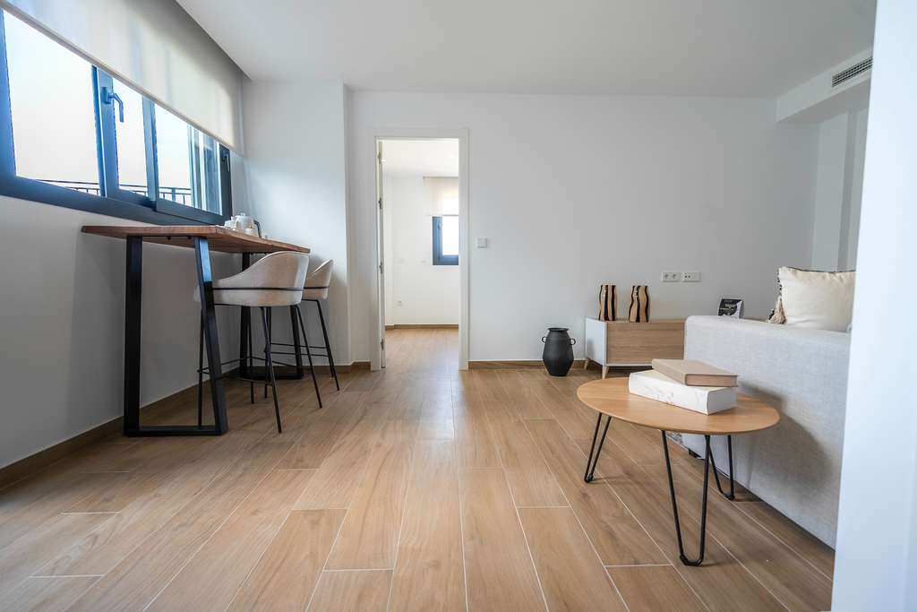La sala de estar y la cocina, de planta abierta, se conectan para formar un conjunto luminoso y elegante. La cocina está totalmente equipada con muebles altos y bajos, encimera de cuarzo con protección antibacteriana y fregadero integrado. Los acabados interiores incluyen paredes y techos lisos con acabado sintético, e iluminación interior y exterior completa.