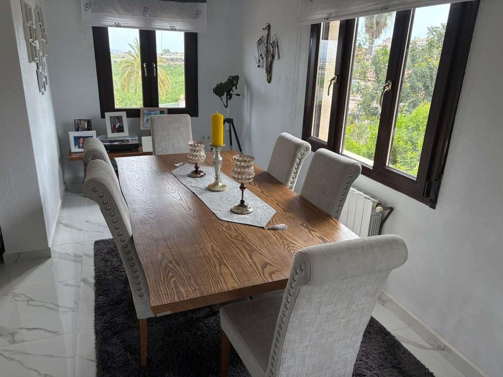 Se vende una impresionante villa independiente ubicada en la tranquila zona de Algorfa. Esta hermosa propiedad de segunda mano cuenta con un generoso espacio interior de 375 metros cuadrados, cinco espaciosas habitaciones y cuatro modernos baños, ideal para familias o quienes disfrutan del entretenimiento. Esta villa se encuentra en una amplia parcela que ofrece privacidad y espacio para actividades al aire libre. Apreciará el interior completamente amueblado que combina comodidad y estilo. Disfrute del cálido clima en su piscina privada o relájese y admire las impresionantes vistas a las montañas y al campo que ofrece esta ubicación. Algorfa es conocida por su ambiente acogedor y está convenientemente cerca de una variedad de servicios, como tiendas, restaurantes y áreas recreativas. El paisaje circundante ofrece un remanso de paz, convirtiéndola en el lugar perfecto para desconectar. No pierda la oportunidad de adquirir esta excepcional propiedad que combina la vida de lujo con la belleza natural. Para más información, contáctenos hoy mismo.
