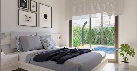 Las villas se distribuyen en 1 planta y constan de 3 dormitorios, 2 baños, cocina americana, salón comedor con vistas abiertas a la terraza, solarium, jardín privado con piscina y parking.