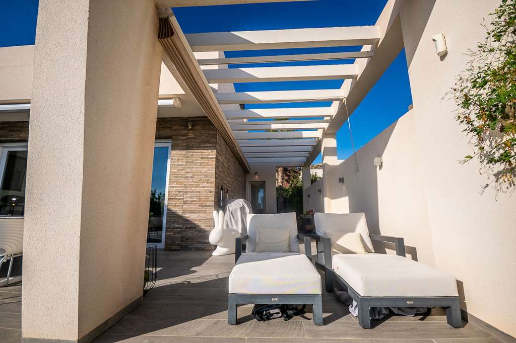 La terraza, parcialmente cubierta por una elegante pérgola con toldos eléctricos , es el lugar ideal para relajarse o entretenerse: un entorno perfecto para disfrutar del clima mediterráneo durante todo el año.