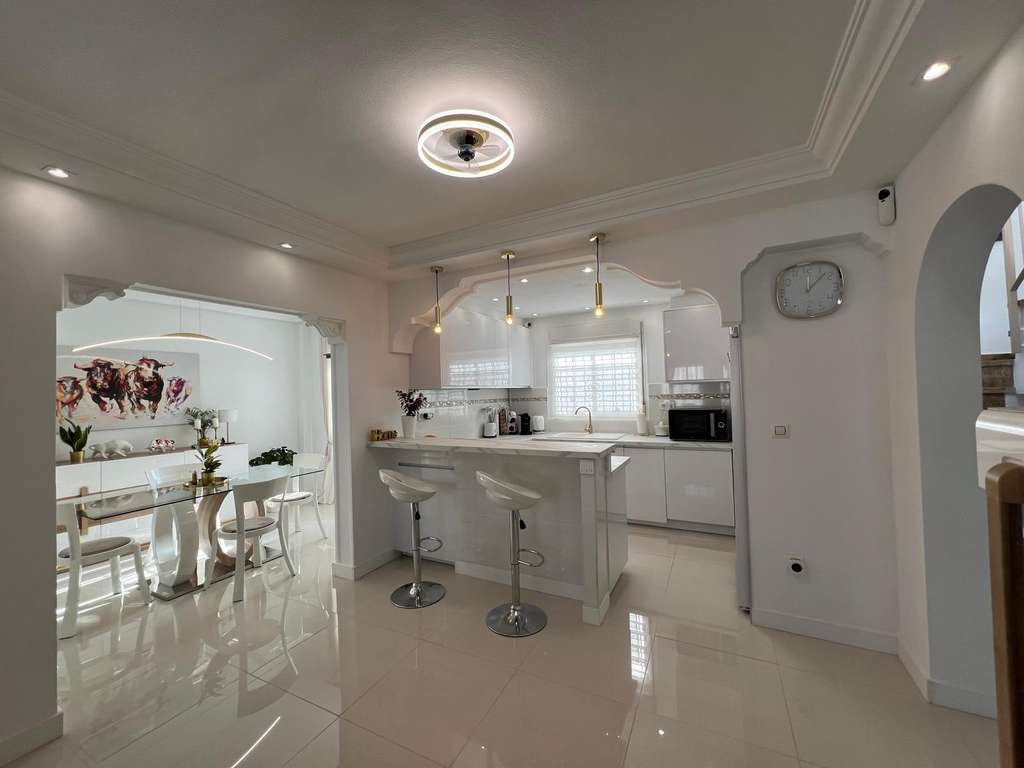 En Venta: Villa Independiente de Lujo Totalmente Reformada – 225 m² de Confort y Estilo Le presentamos esta espectacular villa independiente de tres plantas, completamente renovada con materiales de alta calidad, ubicada en una exclusiva y tranquila urbanización cerrada. A tan solo 1,5 km de tiendas, servicios y con acceso rápido a la autopista, esta propiedad es perfecta para quienes buscan un hogar moderno, espacioso y bien conectado. Detalles Destacados de la Propiedad:Superficie total: 225 m² distribuidos en tres niveles. 5 habitaciones amplias, ideales para familia numerosa, invitados o incluso un despacho en casa. 3 baños elegantes, con acabados contemporáneos. 2 cocinas completamente reformadas, funcionales y luminosas. Armarios empotrados en varias estancias, para un almacenamiento práctico y organizado. Comodidades y Extras Premium: Reforma integral reciente, con suelo nuevo y un moderno sistema de aire acondicionado. Acceso privado y seguro a través de barrera en la entrada de la urbanización. Preinstalación lista para construir una piscina privada dentro de la parcela. Zonas Comunes: Disfrute de dos piscinas comunitarias, perfectas para relajarse en los días soleados sin salir del residencial. Ubicación Estratégica: A pocos minutos de supermercados, comercios y principales vías de acceso. Accesos cómodos desde dos calles, con facilidad de aparcamiento y movilidad. Una oportunidad única para vivir con estilo, comodidad y posibilidad de crecimiento. ¿Le interesa? No dude en contactarnos para más información o concertar una visita privada.