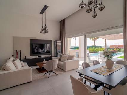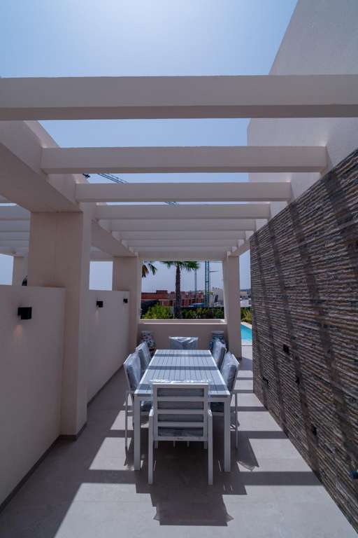 Estamos felices de presentarles esta impresionante villa de lujo ubicada en La Finca Resort, un enclave exclusivo en la Costa Blanca Sur, rodeado de naturaleza, tranquilidad y un campo de golf de renombre internacional. Situada en el nuevo Residencial Mar Egeo, esta propiedad combina diseño contemporáneo, confort y eficiencia energética en un entorno privilegiado con más de 300 días de sol al año. Distribuida en una única planta, más un gran sótano muy luminoso gracias a sus patios interiores tipo patio inglés, la vivienda cuenta con 3 habitaciones con armarios empotrados, incluyendo una elegante suite principal con vestidor y baño privado, y otra habitación también en suite. Dispone de 2 baños completos y un aseo de cortesía, todos con acabados de alta calidad, suelo radiante, mamparas de cristal templado y espejos. La cocina de concepto abierto destaca por su estilo moderno, excelentes materiales y gran capacidad de almacenaje. Equipada con electrodomésticos de última generación, conecta mediante una barra americana con el espacioso salón-comedor, con vistas a la piscina, creando un ambiente acogedor y funcional. Desde el salón, de gran altura, se accede directamente al jardín privado, donde disfrutarás al máximo del clima mediterráneo en su amplia terraza con pérgola de obra, zona de descanso y una piscina privada, ideal para relajarse. La villa se vende totalmente amueblada y equipada, con mobiliario de alta calidad y decorada con gusto hasta el más mínimo detalle, lista para entrar a vivir. Incluye además numerosos extras: •Calefacción y aire acondicionado central en toda la vivienda •Sistema de domótica para climatización, persianas y luces •Paneles solares, para un hogar más sostenible y eficiente •Preinstalación de barbacoa exterior, con tomas de agua y puntos de luz •Garaje cerrado con capacidad para 2 vehículos, con acceso directo al sótano. Esta propiedad es perfecta tanto como residencia habitual como inversión en una de las zonas más demandadas del sur de Alicante. ¡Una oportunidad única en una ubicación inmejorable!