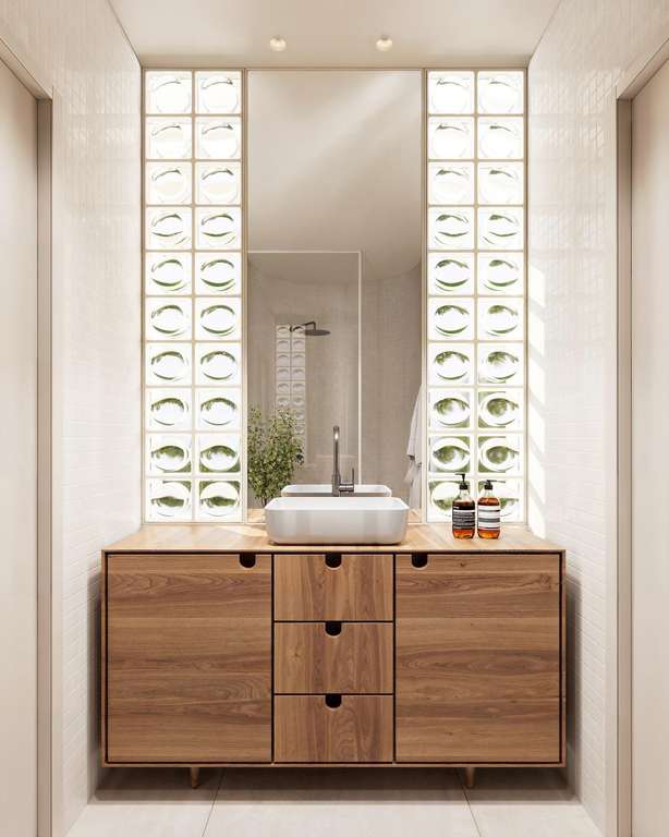 Baños con calefacción por suelo radiante, muebles empotrados con espejos y mamparas de ducha.