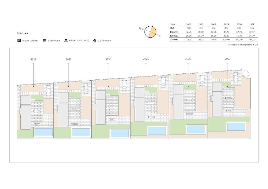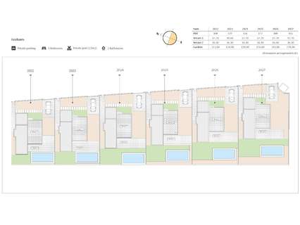 Villas construidas en 2 plantas, dispone de 3 dormitorios, 2 baños, cocina americana con salón, donde se encuentran grandes ventanales con acceso directo a la terraza y a la piscina.