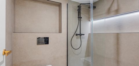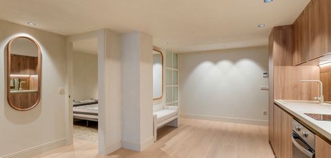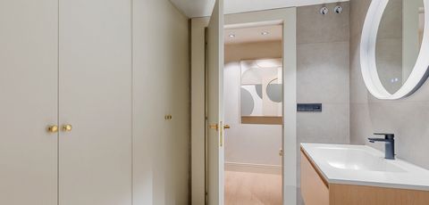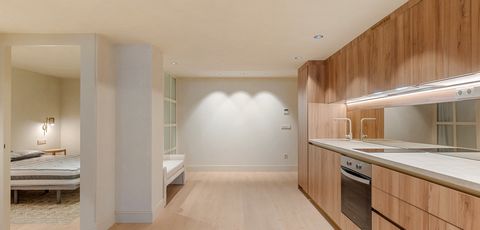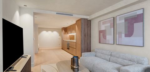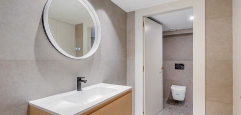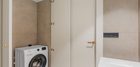 La vivienda cuenta con dos dormitorios, un baño con una zona separada para el lavabo y la lavandería, y una cocina abierta conectada con el salón-comedor. La terraza está acristalada y se accede desde el salón y el dormitorio principal.