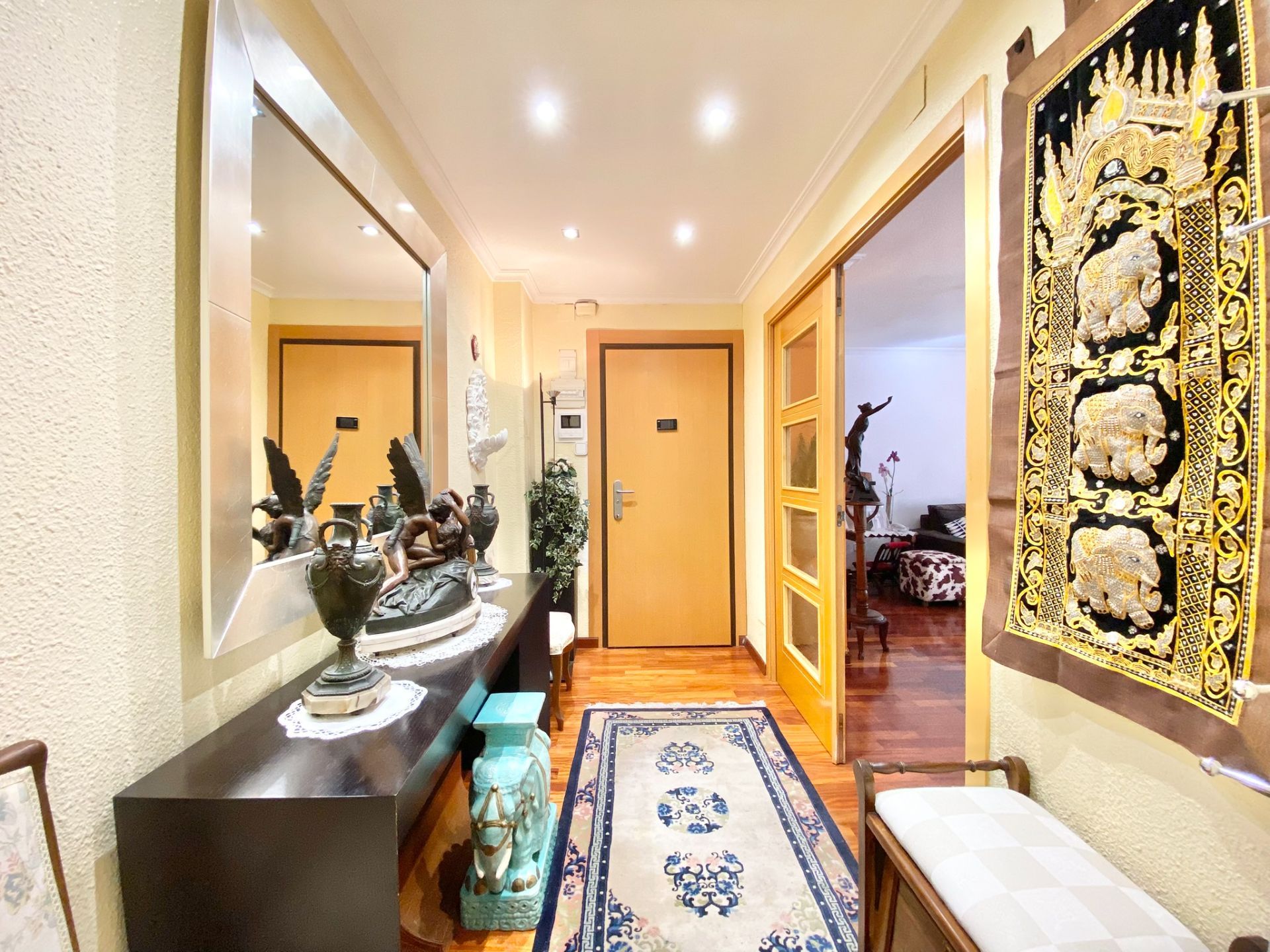 El piso fue reformado hace dos años con materiales de calidad y ha tenido muy poco uso, por lo que se encuentra en excelente estado de conservación. Cuenta con tres habitaciones de muy buen tamaño, todas con armarios empotrados. La habitación principal dispone de baño en suite, mientras que las dos habitaciones auxiliares comparten un segundo baño completo.