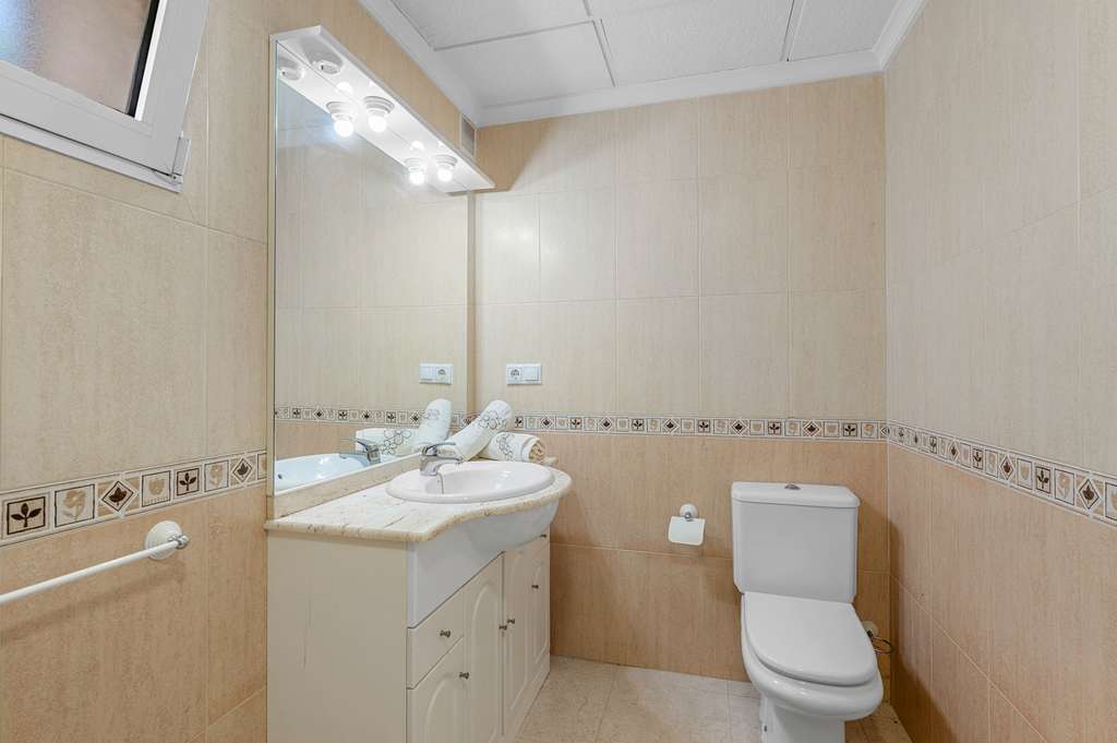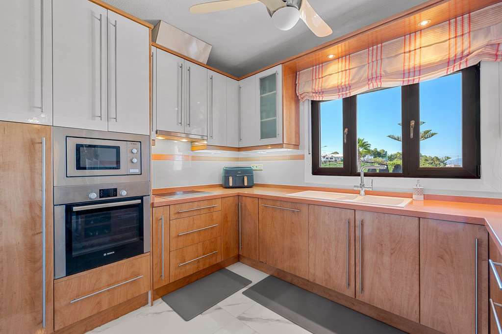 Con entrada independiente, la planta baja alberga un apartamento con 2 dormitorios adicionales, un amplio salón y una cocina totalmente equipada con abundante espacio de almacenamiento, perfecto para recibir invitados asegurando su privacidad.