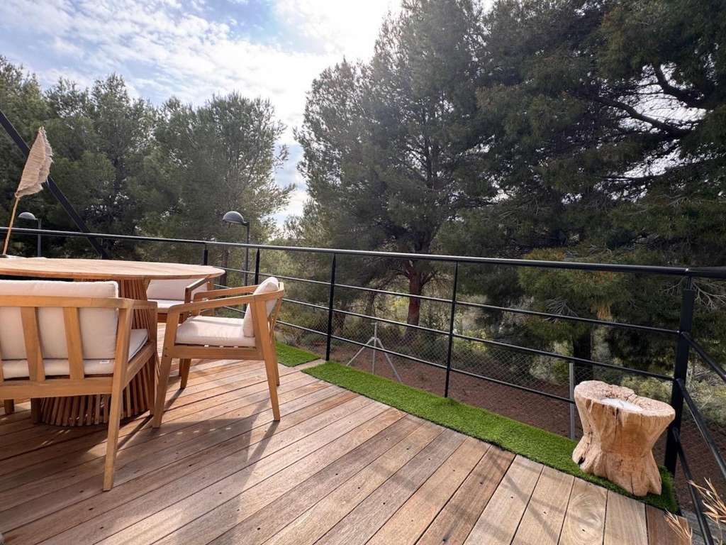 La vivienda cuenta con un encantador balcón orientado al sureste, con vistas abiertas a la pinada, que se convierte en una agradable extensión del salón. Gracias a su toldo eléctrico, este espacio puede disfrutarse durante todo el año, ya sea para desayunar al sol o relajarse al final del día. Justo debajo del balcón se encuentra la plaza de aparcamiento exclusiva de la propiedad, que además queda protegida, aunque la urbanización dispone también de espacios adicionales para estacionar.