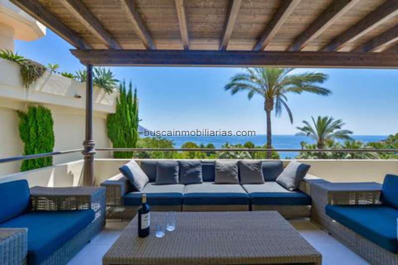 bungalow en primera línea de mar ubicado en la prestigiosa urbanización villa gadea de altea. la vivienda ha sido completamente renovada con las mejores calidades y está distribuida en tres plantas. en la primera planta se encuentra un gran salón comedor y cocina toda abierta con salida directa a una amplia terraza con una  parte cubierta y magnífica parcela con jardín privado aseo de cortesía y cuarto de lavandería. la parcela del bungalow tiene acceso directo a una preciosa piscina comunitaria cuyo uso comparten sólo 4 viviendas. a unos 100 metros se encuentra una salida directa a una tranquila playa. en la segunda planta se encuentran 3 dormitorios y 2 baños uno de ellos en suite además 2 habitaciones tienen terraza propia. la habitación principal dispone de increíbles vistas al mar a la isla de altea y panorámicas al pueblo. por último en la tercera planta encontramos una cuarta habitación un baño y una terraza actualmente cubierta. desde los tres niveles las vistas son maravillosas.  la vivienda tiene suelo radiante en todas las zonas de la propiedad aire acondicionado central y 2 plazas de aparcamiento cubiertas. la urbanización cuenta con vigilancia privada las 24 horas del día 10 piscinas comunitarias maravillosos jardines y acceso directo a la playa.