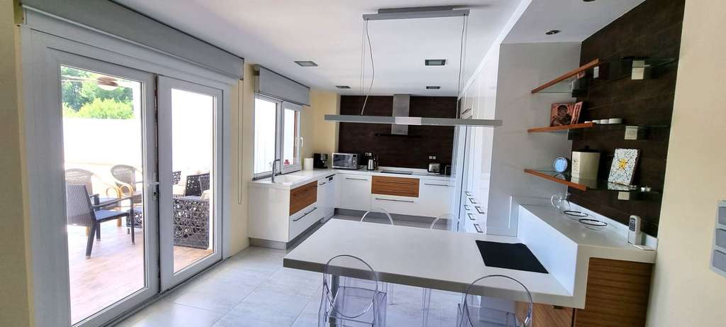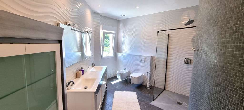 La villa terminada tiene 7 dormitorios y 5 baños. La distancia al mar y a la ciudad es de 3 km.