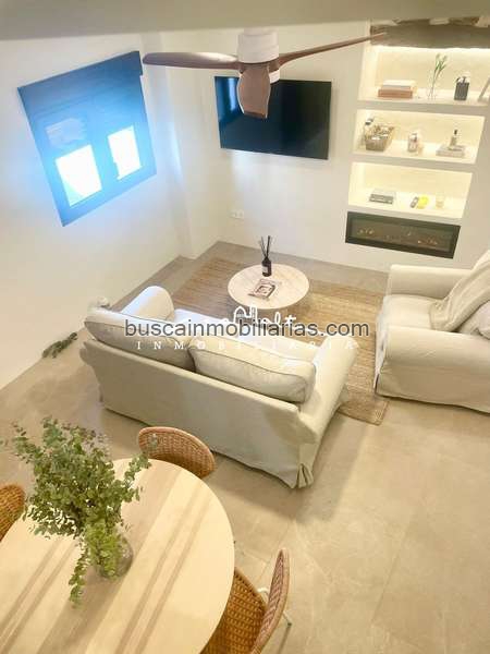 La planta baja se abre a un amplio salón‑cocina totalmente equipado, donde la piedra original de la pared ha sido cuidadosamente dejada a la vista, aportando calidez y carácter al espacio. Los acabados en blanco y los detalles en madera clara refuerzan la estética ibicenca, creando un ambiente luminoso y acogedor.