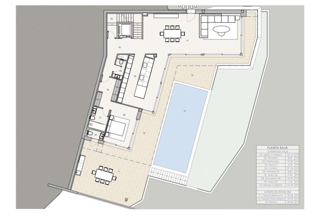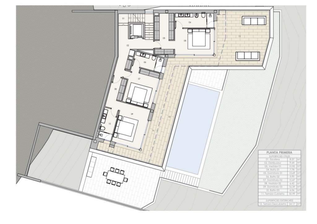 La villa alberga 4 habitaciones en total, de las cuales 3 de ellas disponen de baño en suite y vestidor, proporcionando un nivel de privacidad y comodidad excepcionales. Además, cuenta con 2 aseos adicionales para invitados. La cocina, totalmente equipada y con una isla central, se integra de manera perfecta con una espaciosa sala de estar. Desde aquí, se accede a una generosa terraza que se presenta como el lugar perfecto para disfrutar del clima mediterráneo y de las vistas panorámicas. La propiedad incluye un garaje y una piscina de 40 m2, todos ellos construidos con materiales de primera calidad y acabados impecables.