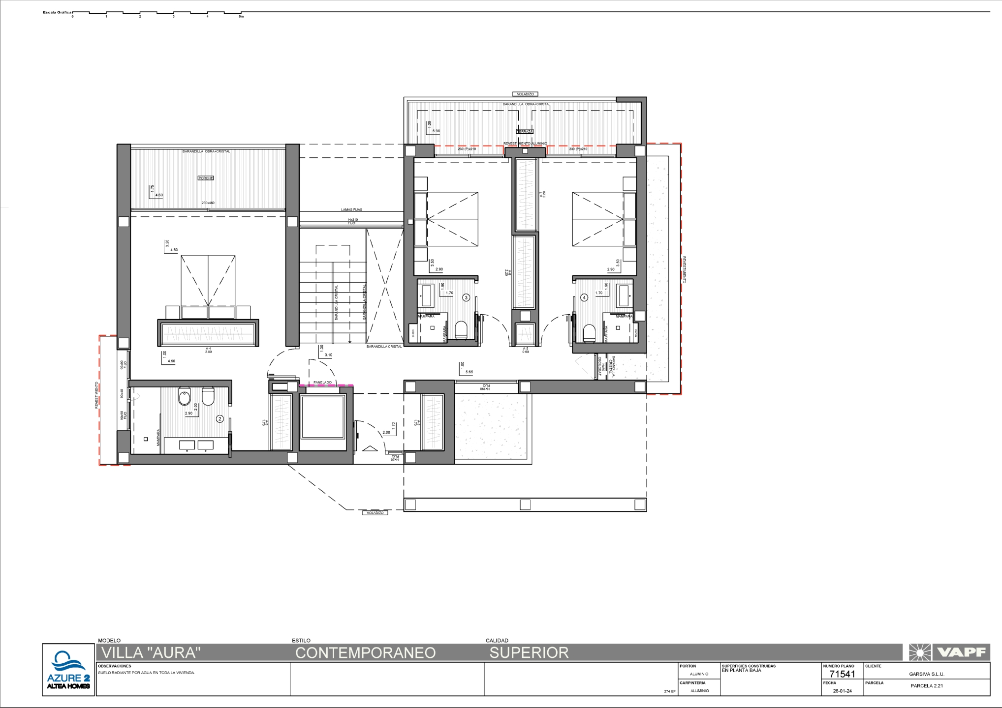 Villa Aura incorpora soluciones de última generación: climatización por aerotermia, ventilación con recuperación de calor, suelo radiante, domótica, placas fotovoltaicas, preinstalacion de punto de recarga de coche eléctrico, materiales de alta eficiencia energética, mobiliario y decoración. Todo en ella está orientado a proporcionar bienestar, estilo y funcionalidad, desde el primer momento.