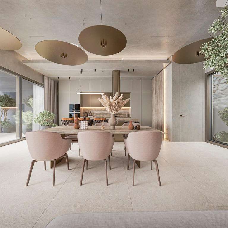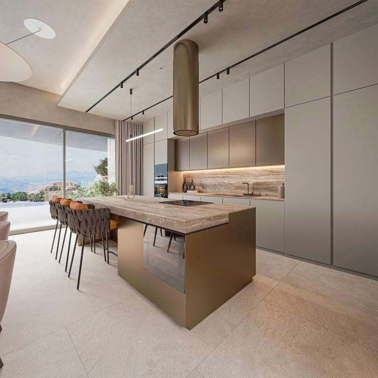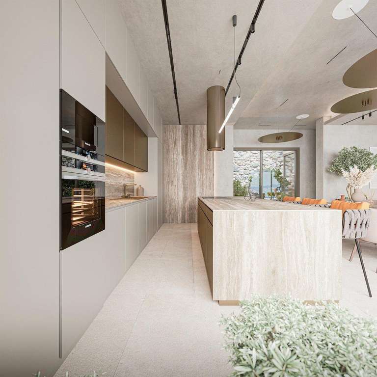 La moderna cocina cuenta con muebles italianos y electrodomésticos Siemens, creando un ambiente elegante y funcional ideal tanto para la vida cotidiana como para recibir invitados. Los grandes ventanales crean una conexión continua con las terrazas exteriores, aprovechando al máximo el estilo de vida mediterráneo.