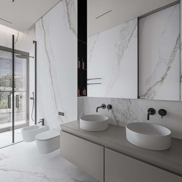 La propiedad ofrece cuatro amplios dormitorios con baño en suite, cada uno diseñado como un refugio privado con acabados de alta calidad y acceso directo a las terrazas. La suite principal destaca por su vestidor y su lujoso baño con bañera independiente con vistas al mar, creando una atmósfera verdaderamente relajante inspirada en los entornos de los spas de lujo.