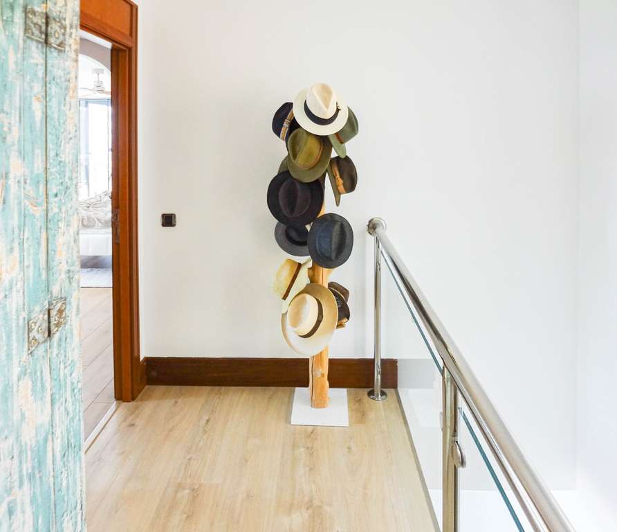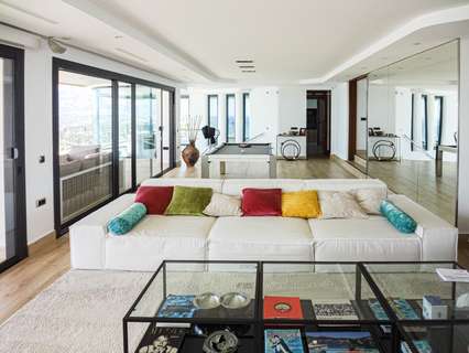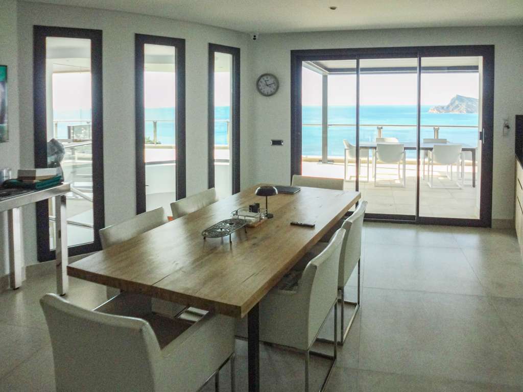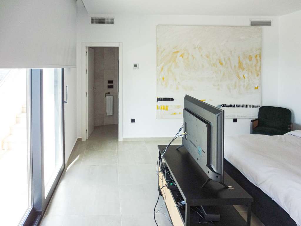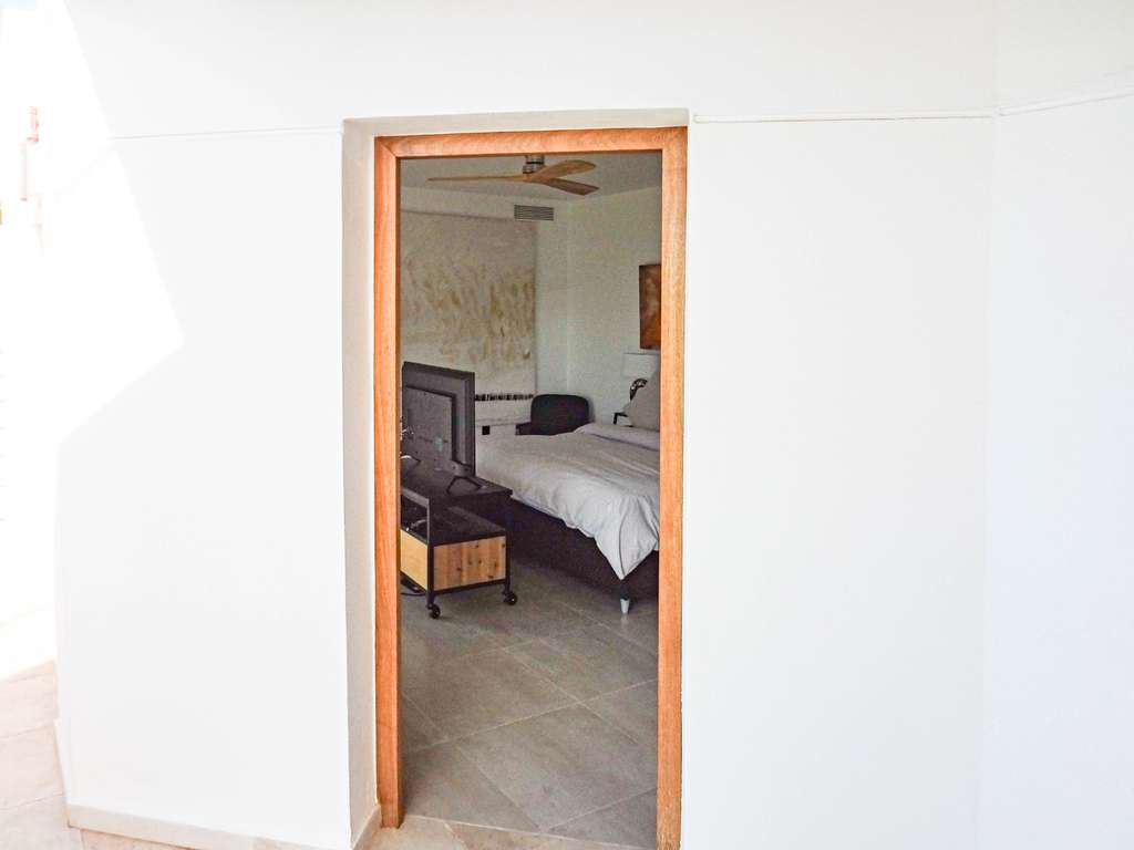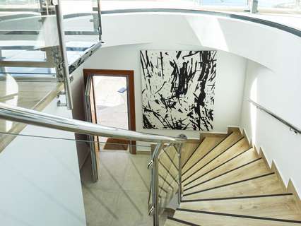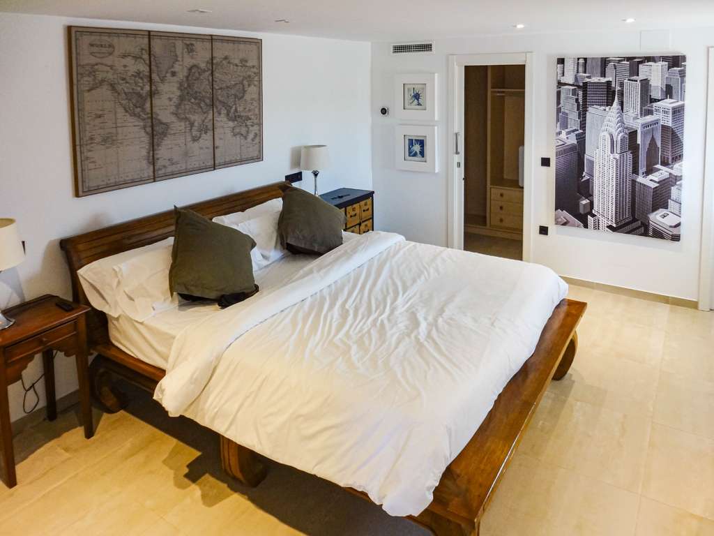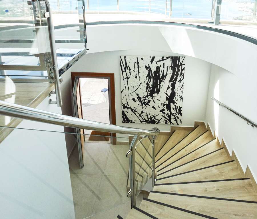 La planta superior, accesible por escaleras, cuenta con tres dormitorios, tres baños, vestidor, despacho y una terraza de 30 m² que rodea la fachada, ofreciendo vistas abiertas al mar desde todas las estancias.