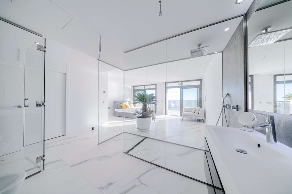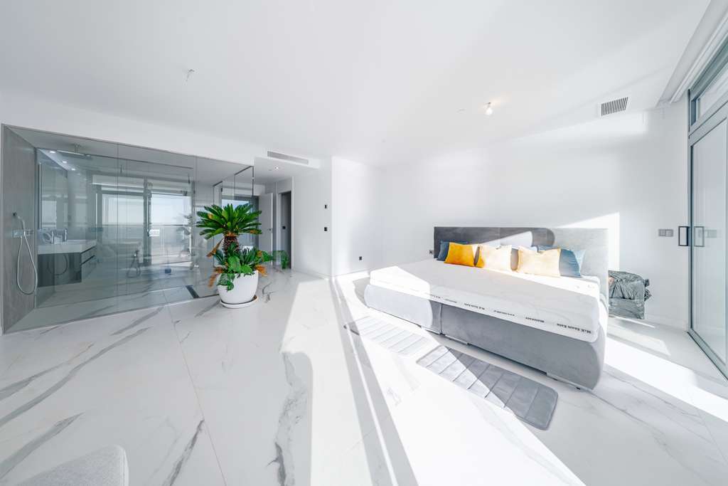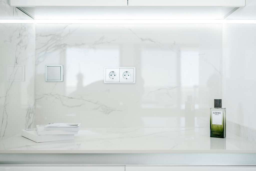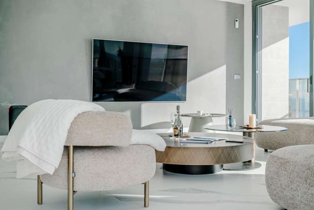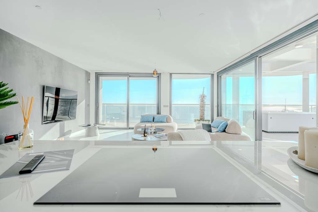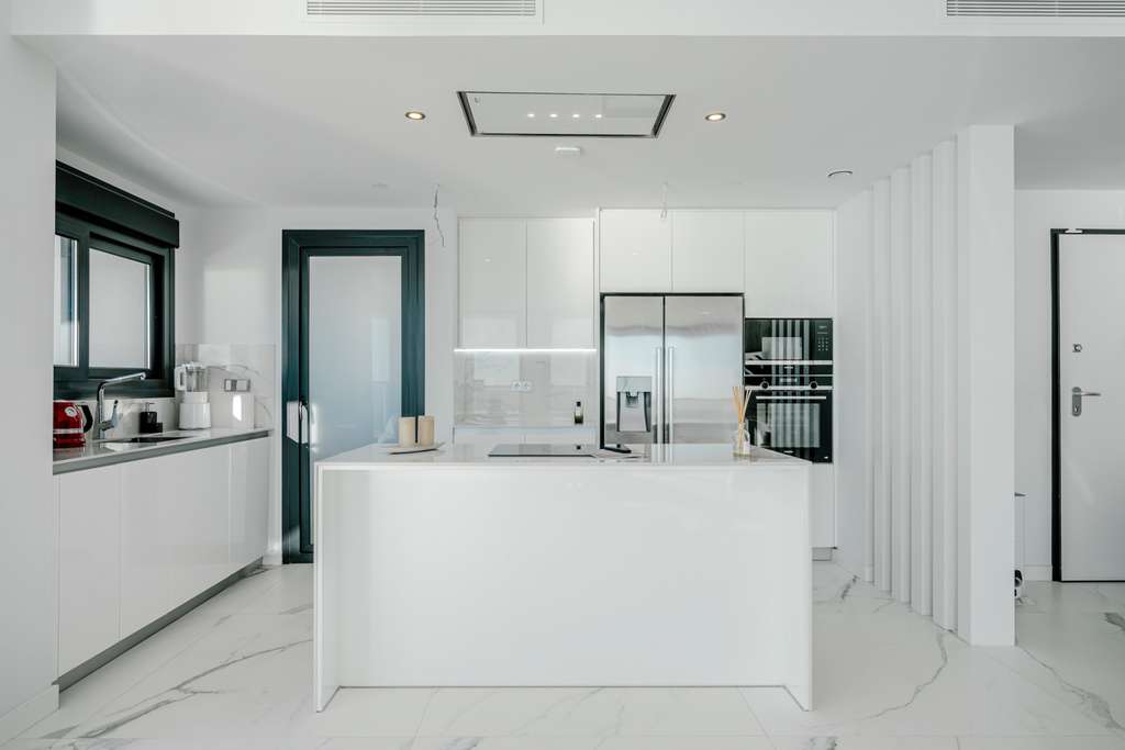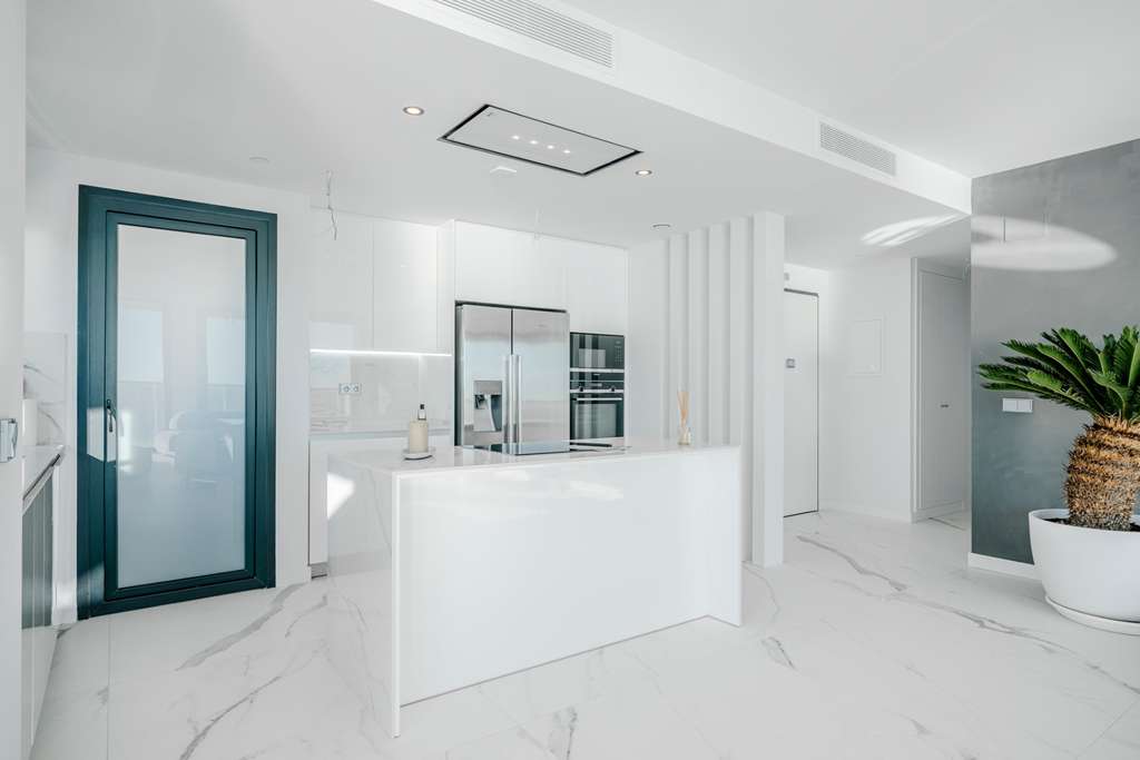 La amplia sala de estar está bañada por la luz natural, con una cocina de concepto abierto equipada con electrodomésticos inteligentes Samsung de alta gama y acabados exclusivos de Porcelanosa. Con su diseño impecable y materiales de primera calidad, este espacio es perfecto tanto para la vida cotidiana como para el entretenimiento.