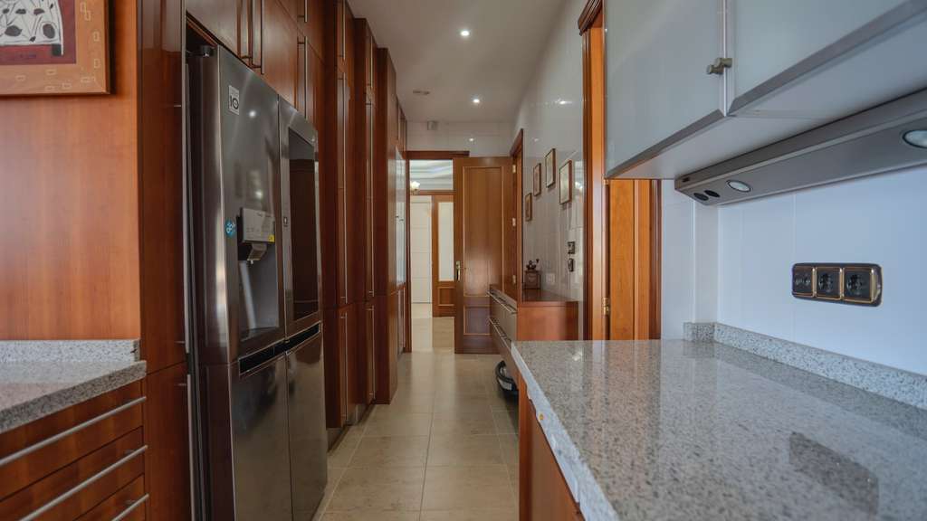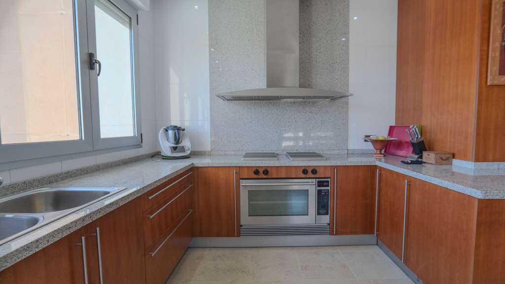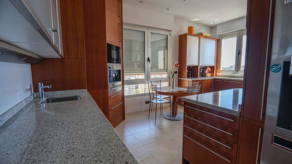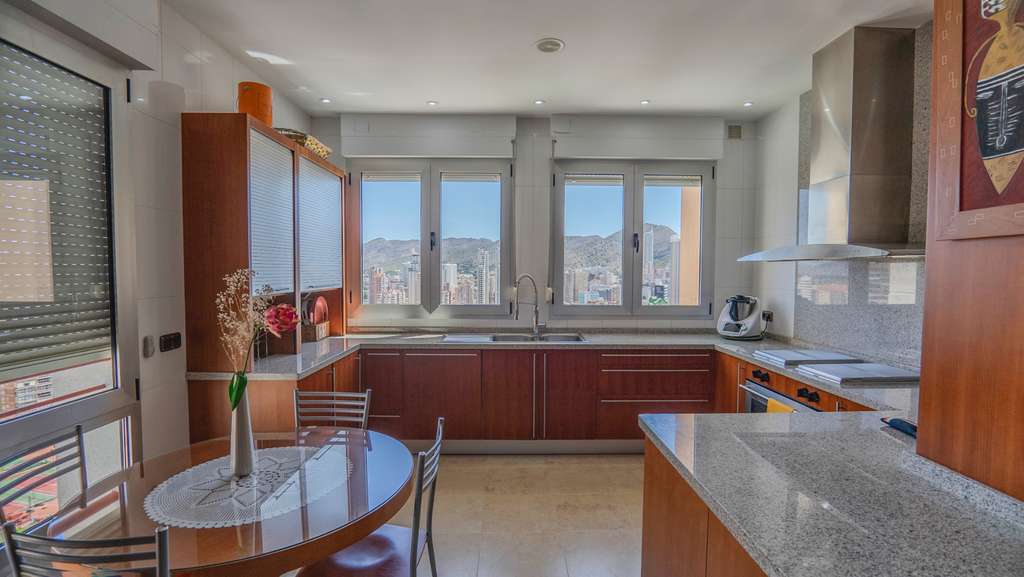 A continuación, acceda a la gran cocina independiente, equipada con encimeras de granito y electrodomésticos de alta gama. El espacio está bien pensado y es perfecto para los entusiastas de la cocina o para su chef privado. Desde la ventana de la cocina se disfrutan hermosas vistas de la ciudad de Benidorm a las montañas. #13; #13;